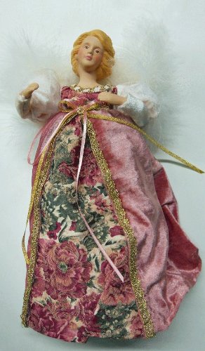 Highlight the apex of your Christmas tree this season with this ornate angel tree topper, wearing an elegant rose and gold gown, detailed with a gold and pink trim. Her porcelain face and hands really give her the look of an angelic angel. Under her dress there is a place to attach the plastic cylinder (included) to help her stand atop a tree. Topper is so versatile that it can also be used as a table top decoration as well